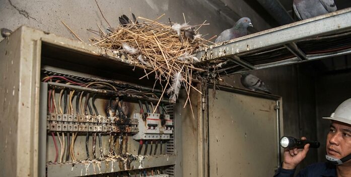 工場の屋根や梁、電気設備周辺に鳥が巣を作ると電線や配線ダクトにフンや巣材が接触し、絶縁不良やショートを引き起こすリスクが高まります。特にキュービクル周辺、屋外配線、照明器具、制御盤付近は鳥害の影響を受けやすく、実際にフンや巣材が原因で漏電・発煙・火災につながった事例も報告されています。